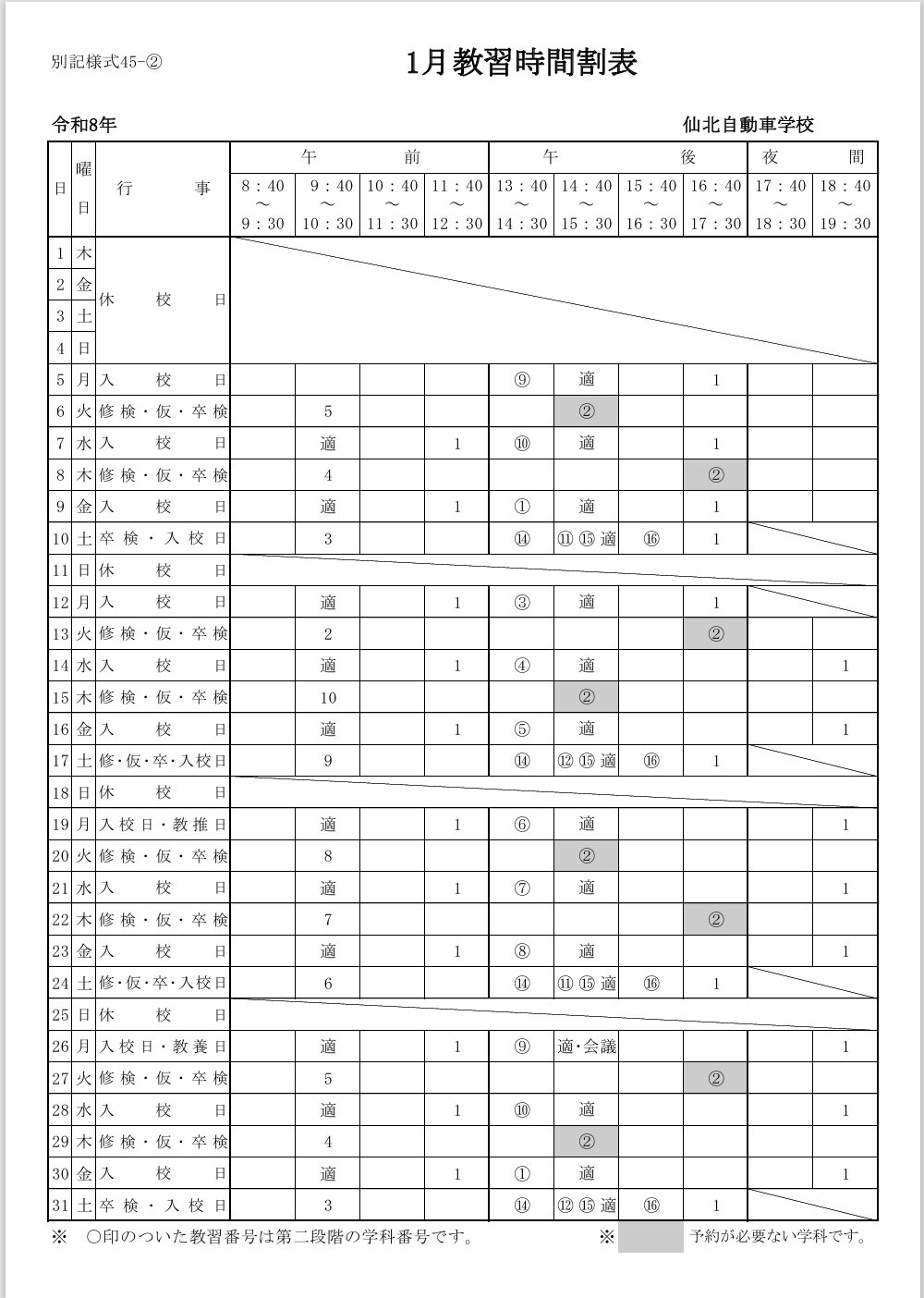 来月の教習時間割